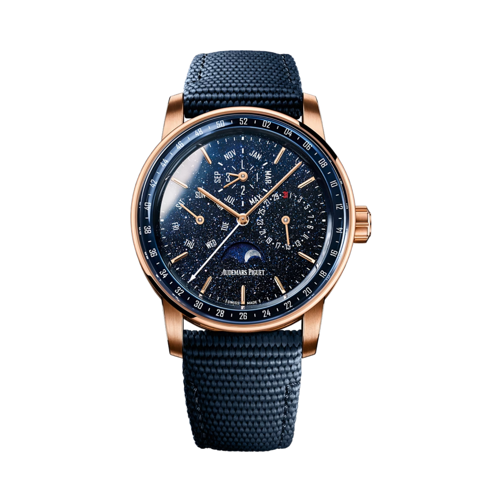 Trải nghiệm trên cổ tay là sự cảm nhận về một trong những bộ máy lịch vạn niên mỏng nhất thế giới – Calibre 5134. Dựa trên nền tảng của bộ máy 2120 huyền thoại, cỗ máy này có khả năng tự động điều chỉnh chính xác độ dài các tháng và cả năm nhuận cho đến tận năm 2100 (nếu được lên cót liên tục). Đặc biệt, vòng bezel bên trong còn hiển thị 52 tuần trong năm, một tính năng hiếm gặp và đầy tinh tế. Dưới lớp kính sapphire vòm kép, mặt số Aventurine hiện lên với chiều sâu hun hút, làm nổi bật bộ kim và cọc số bằng vàng hồng rực rỡ. Với dây đeo vải bọc cao su hiện đại, 26394OR không chỉ là một cỗ máy thời gian siêu phức tạp mà còn là biểu tượng của sự lịch lãm, đẳng cấp và tầm nhìn vượt thời đại.