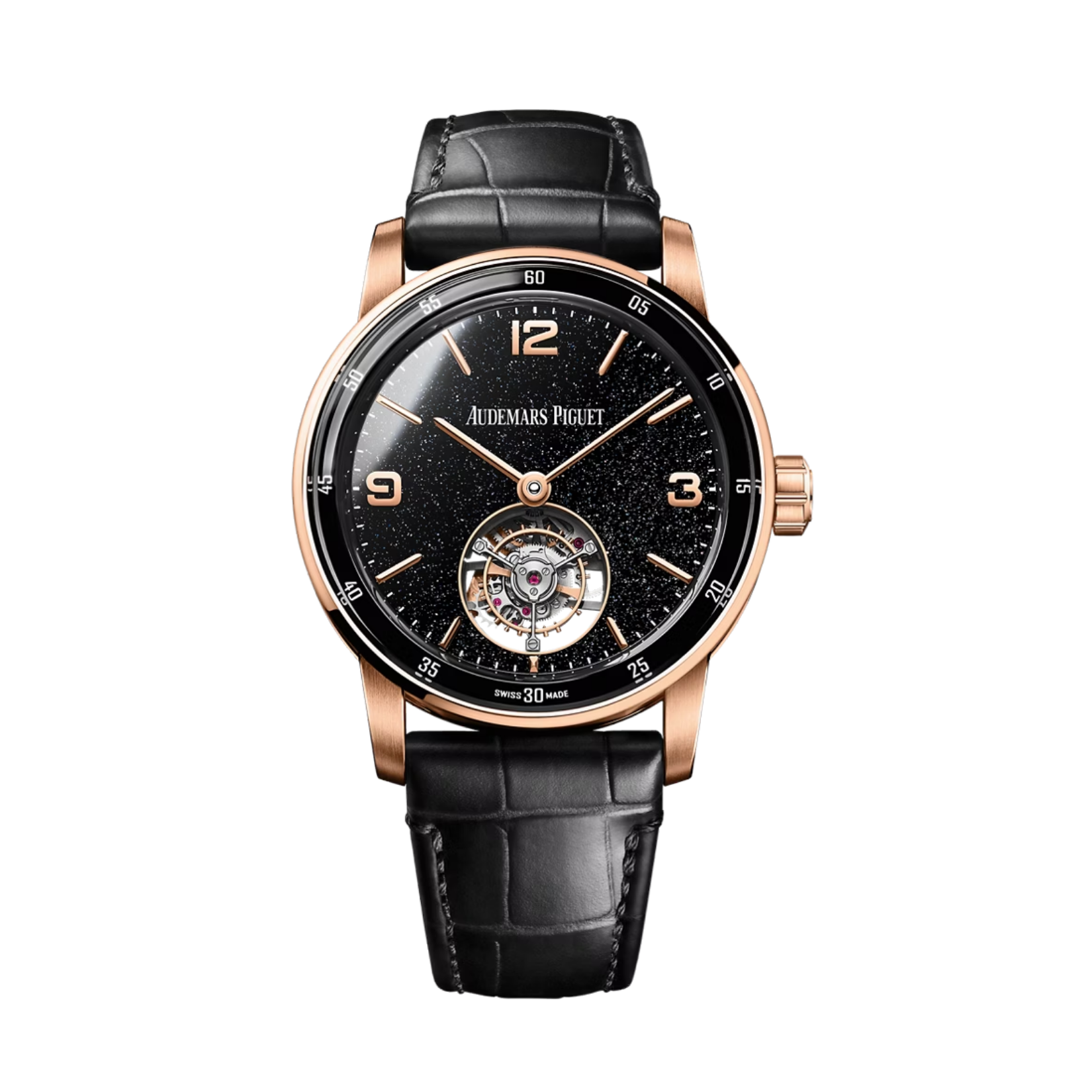Audemars Piguet Code 11.59 Flying Tourbillon 26396OR là sự kết hợp tuyệt mỹ giữa nghệ thuật chế tác mặt số truyền thống và kỹ nghệ Haute Horlogerie đỉnh cao. Điểm nhấn thu hút mọi ánh nhìn chính là mặt số Sơn mài đen (Black Lacquer) được hoàn thiện bóng bẩy, sâu thẳm như một tấm gương đen huyền bí. Trên nền đen thuần khiết đó, các cọc số và bộ kim bằng vàng hồng trở nên nổi bật rực rỡ, tạo nên một sự tương phản đầy quyền lực và quý tộc. Sự phối hợp giữa sắc ấm của Vàng hồng 18k và màu đen cổ điển giúp chiếc đồng hồ này trở thành một trong những phiên bản Code 11.59 mang vẻ đẹp vượt thời gian nhất.