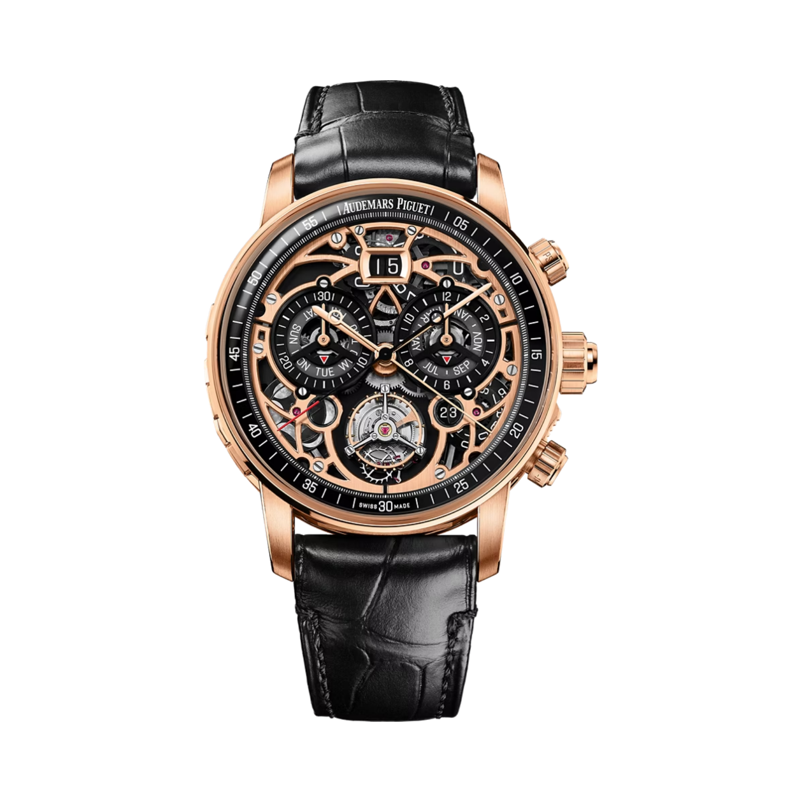 Audemars Piguet Code 11.59 Ultra-Complication Universelle (RD#4) 26398OR.99 là sự kết hợp hoàn mỹ giữa đỉnh cao kỹ thuật cơ khí và sự ấm áp rực rỡ của Vàng hồng 18k. Nếu các phiên bản vàng trắng mang vẻ đẹp của những cỗ máy tương lai, thì phiên bản vàng hồng này lại mang đến một hơi thở vương giả, cổ điển nhưng cực kỳ quyền lực. Với thiết kế mặt số lộ cơ hoàn toàn, toàn bộ hơn 1.100 chi tiết tinh vi của bộ máy Calibre 1000 được phô diễn, tạo nên sự tương phản tuyệt đẹp giữa sắc vàng hồng của vỏ và các chi tiết máy màu xám, đen và bạc, biến chiếc đồng hồ thành một kỳ quan kiến trúc cơ khí ngay trên cổ tay.