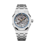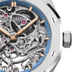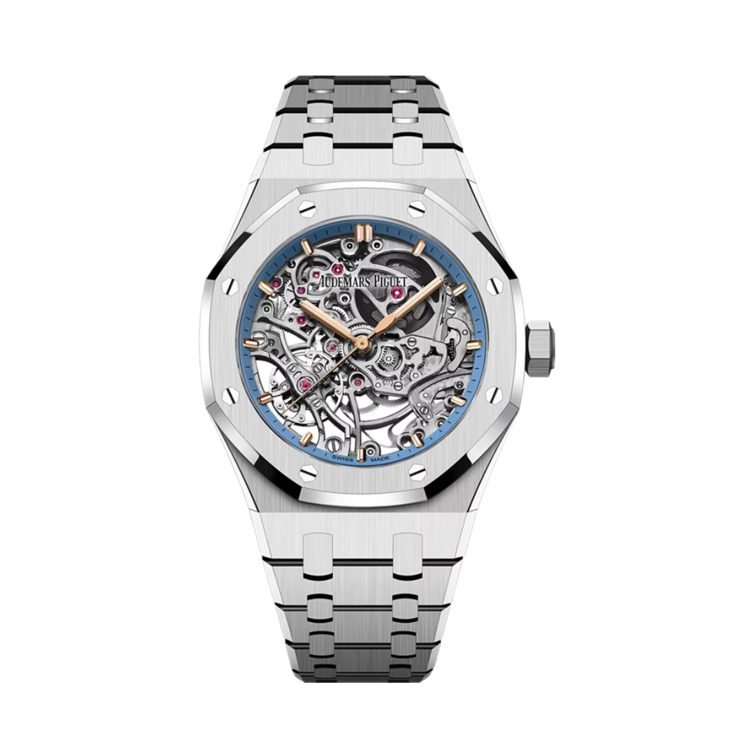 Mặt số skeleton chế đặc trưng của dòng Royal Oak, với các cầu nối và chi tiết được hoàn thiện tinh xảo. Vòng bezel bên trong màu xanh nhạt tạo nên sự tương phản nhẹ nhàng, làm nổi bật tổng thể thiết kế. Cọc số bằng vàng hồng cùng kim Royal Oak phủ chất phát quang không chỉ tăng tính thẩm mỹ mà còn đảm bảo khả năng đọc rõ ràng trong mọi điều kiện ánh sáng.