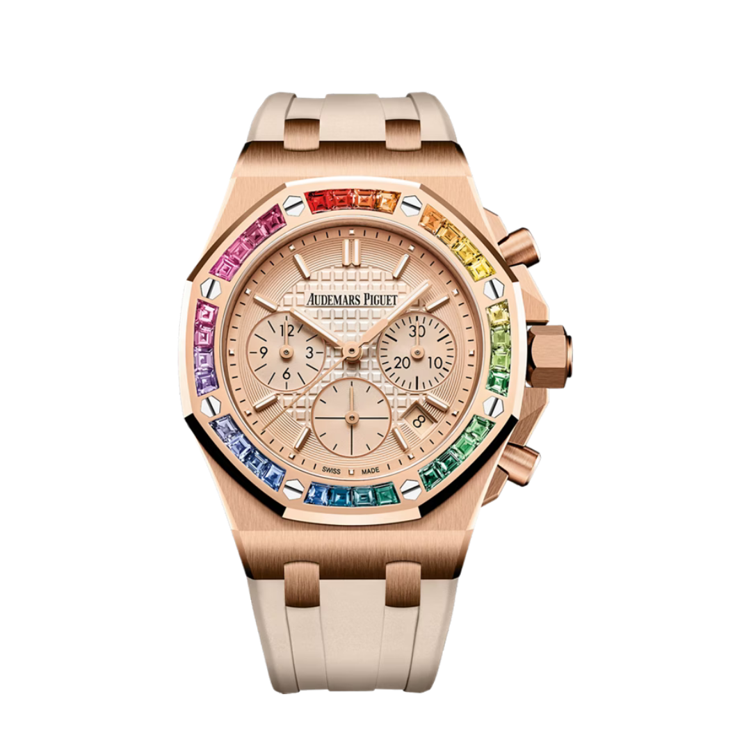 Điểm nhấn hoàn thiện nằm ở dây đeo cao su màu be, mềm mại và thoải mái, đồng thời mang đến nét hiện đại và thanh lịch. Dây đeo được kết hợp cùng khóa gập AP bằng vàng hồng 18-carat, tạo sự liền mạch và sang trọng hoàn hảo.