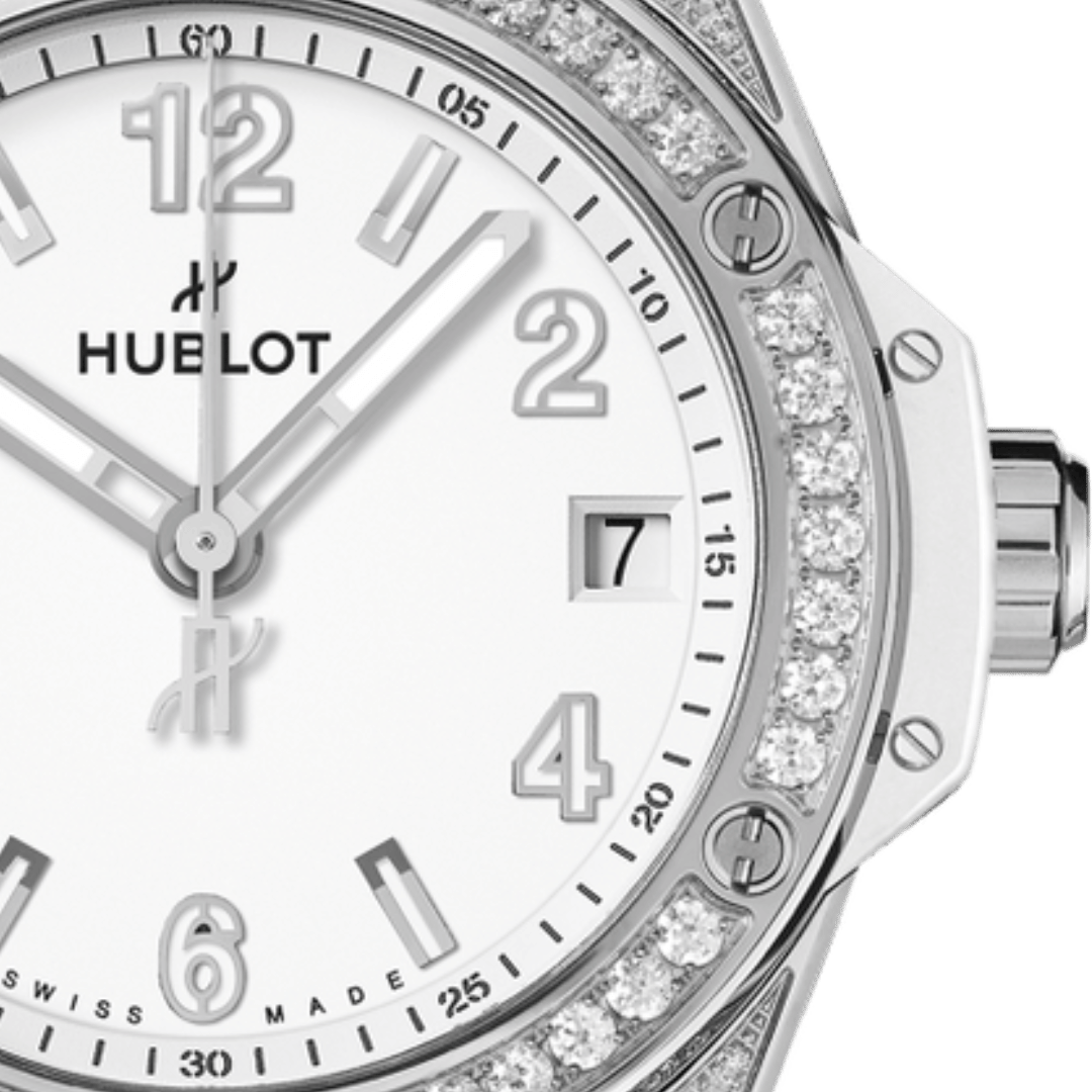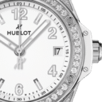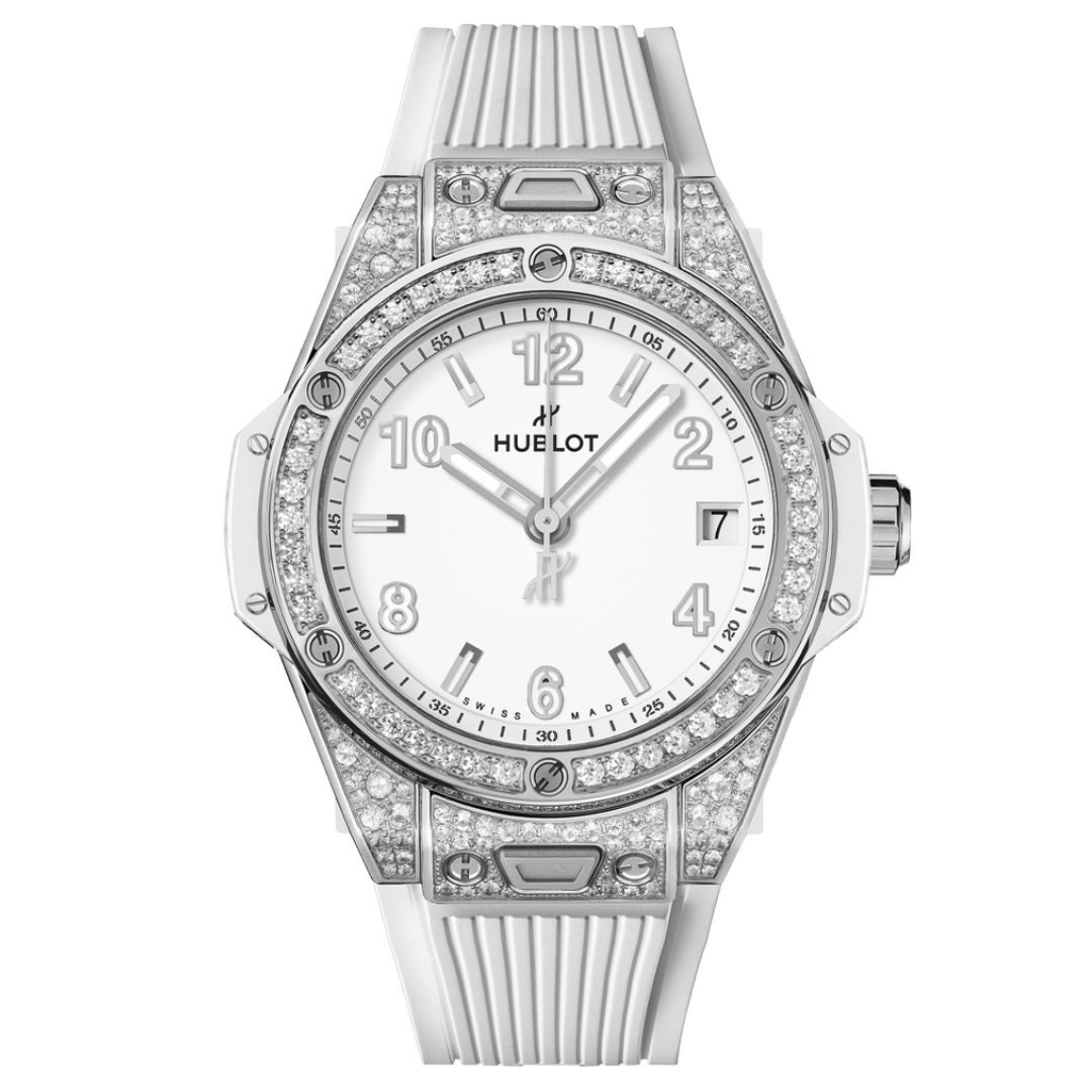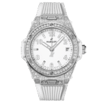 Mặt số màu trắng mờ, cùng với các kim chỉ thanh mảnh và vạch chỉ giờ tinh tế, tạo nên sự khác biệt đầy mê hoặc. Điểm nhấn tạo nên sự khác biệt và định danh cho mẫu 465.SE.2010.RW.1604 chính là vành bezel cố định bằng thép không gỉ đính 42 viên kim cương. Vành bezel này không chỉ mang đến vẻ ngoài xa hoa mà còn là một yếu tố thiết kế biểu tượng của Hublot. Hoàn thiện vẻ ngoài nữ tính và đẳng cấp này là dây đeo cao su trắng có cấu trúc mềm mại và thoải mái.