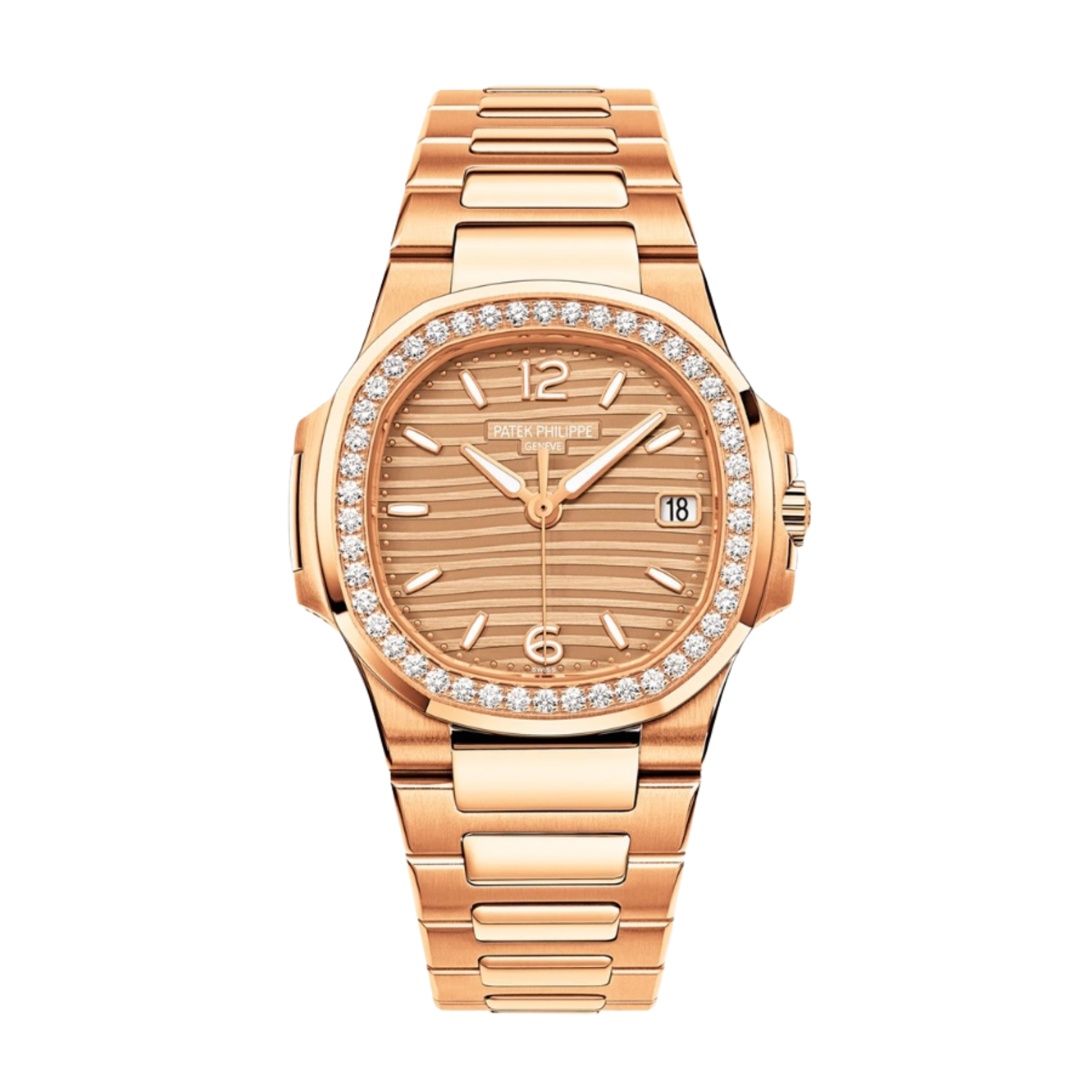 Patek Philippe Nautilus 7010/1R-012 là tuyệt phẩm trang sức thời gian lộng lẫy, đại diện cho vẻ đẹp vương giả và ấm áp của tông màu “Gold-on-Gold” (Vàng trên Vàng). Với kích thước nhỏ nhắn 32mm, chiếc đồng hồ được thiết kế dành riêng cho những cổ tay ngọc ngà, thanh mảnh. Toàn bộ lớp vỏ và dây đeo được chế tác từ vàng hồng 18k nguyên khối, toát lên khí chất quý phái tột bậc. Điểm nhấn rực rỡ nằm ở vành bezel bát giác được nạm 46 viên kim cương tinh khiết (khoảng 0.73 carat), tạo thành vòng hào quang bao quanh mặt số màu Nâu Vàng (Golden Brown). Họa tiết lượn sóng mềm mại trên mặt số cộng hưởng với ánh vàng hồng tạo nên một tổng thể liền mạch, tỏa sáng rạng ngời dưới mọi góc độ ánh sáng.