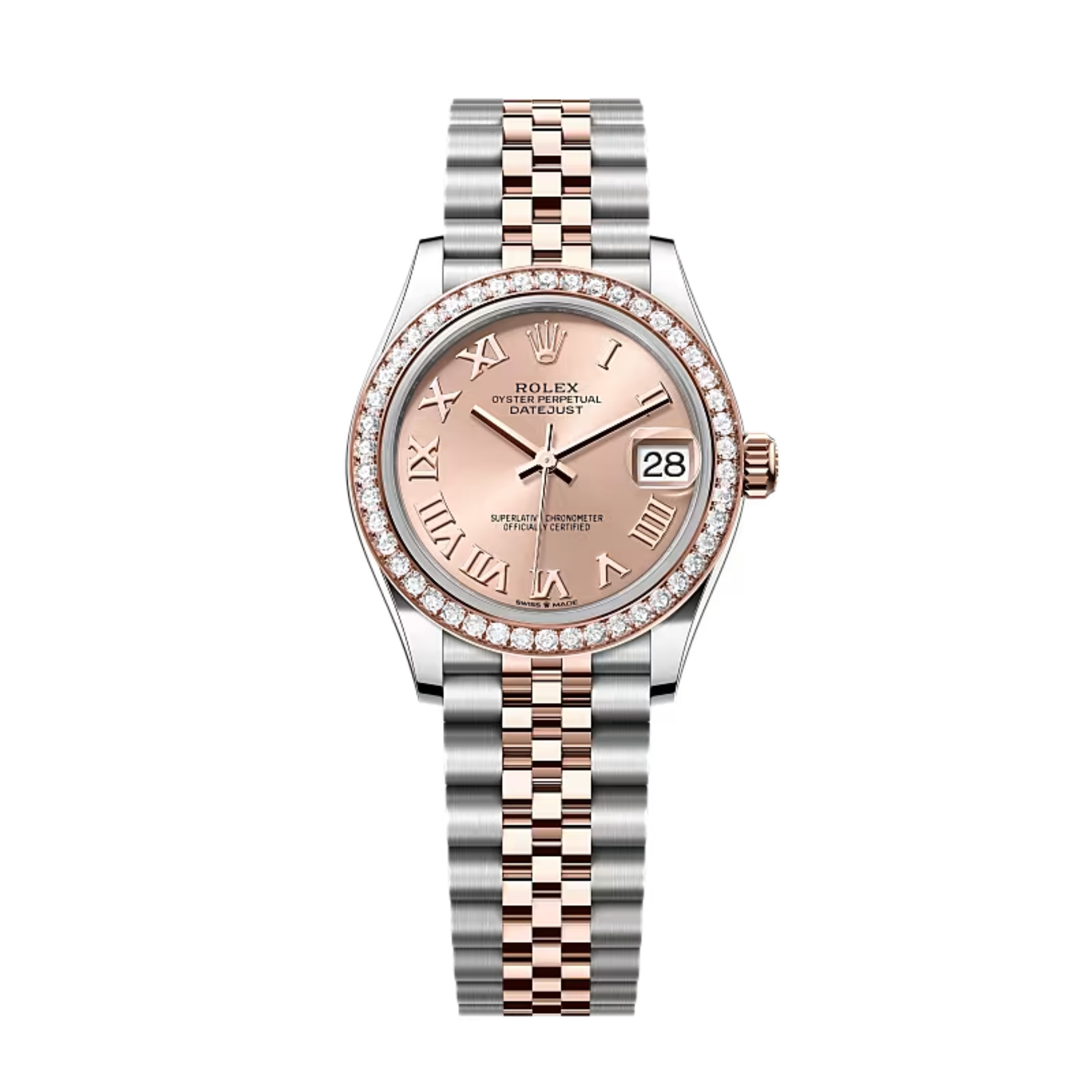Rolex Datejust 31 278381RBR-0002 tựa như một bản tình ca ngọt ngào trên cổ tay, chinh phục phái đẹp bằng sắc Hồng (Pink) dịu dàng của mặt số chải tia sunray. Tông màu nữ tính này tạo nên sự đồng điệu hoàn hảo với chất liệu Rolesor Everose – sự hòa quyện giữa thép Oystersteel sáng bóng và vàng hồng 18ct ấm áp trên dây đeo Jubilee 5 mối nối. Điểm nhấn đắt giá khẳng định vị thế của chiếc đồng hồ nằm ở cọc số La Mã VI được nạm 11 viên kim cương tinh xảo, tỏa sáng rực rỡ cùng vòng hào quang của vành bezel nạm 46 viên kim cương brilliant, mang lại diện mạo vừa kiêu sa, vừa đài các.