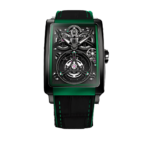 Vỏ đồng hồ kích thước 36,3mm x 49,8mm, được chế tác từ titan chải xước, hoàn thiện với lớp phủ PVD đen và viền nhôm microblasted anod hóa xanh lá, mang đến vẻ đẹp sắc sảo, mạnh mẽ. Mặt kính sapphire trong suốt giúp làm nổi bật thiết kế đặc biệt, để lộ bộ máy Flying Tourbillon 20mm, một trong những điểm nhấn ấn tượng nhất của chiếc đồng hồ này.