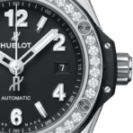 Mặt số màu đen mờ với 11 viên kim cương làm chỉ giờ, cùng với các kim chỉ thanh mảnh, tạo nên sự khác biệt đầy mê hoặc. Điểm nhấn tạo nên sự khác biệt và định danh cho mẫu 485.SX.1170.RX.1204 chính là vành bezel cố định bằng thép không gỉ đính 36 viên kim cương. Vành bezel này không chỉ mang đến vẻ ngoài xa hoa mà còn là một yếu tố thiết kế biểu tượng của Hublot. Hoàn thiện vẻ ngoài nữ tính và đẳng cấp này là dây đeo cao su đen có cấu trúc mềm mại và thoải mái.