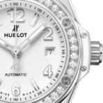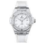 Mặt số màu trắng mờ, cùng với các kim chỉ thanh mảnh và vạch chỉ giờ tinh tế, tạo nên sự khác biệt đầy mê hoặc. Điểm nhấn tạo nên sự khác biệt và định danh cho mẫu 485.SE.2010.RW.1204 chính là vành bezel cố định bằng thép không gỉ đính 36 viên kim cương. Vành bezel này không chỉ mang đến vẻ ngoài xa hoa mà còn là một yếu tố thiết kế biểu tượng của Hublot. Hoàn thiện vẻ ngoài nữ tính và đẳng cấp này là dây đeo cao su trắng có cấu trúc mềm mại và thoải mái.