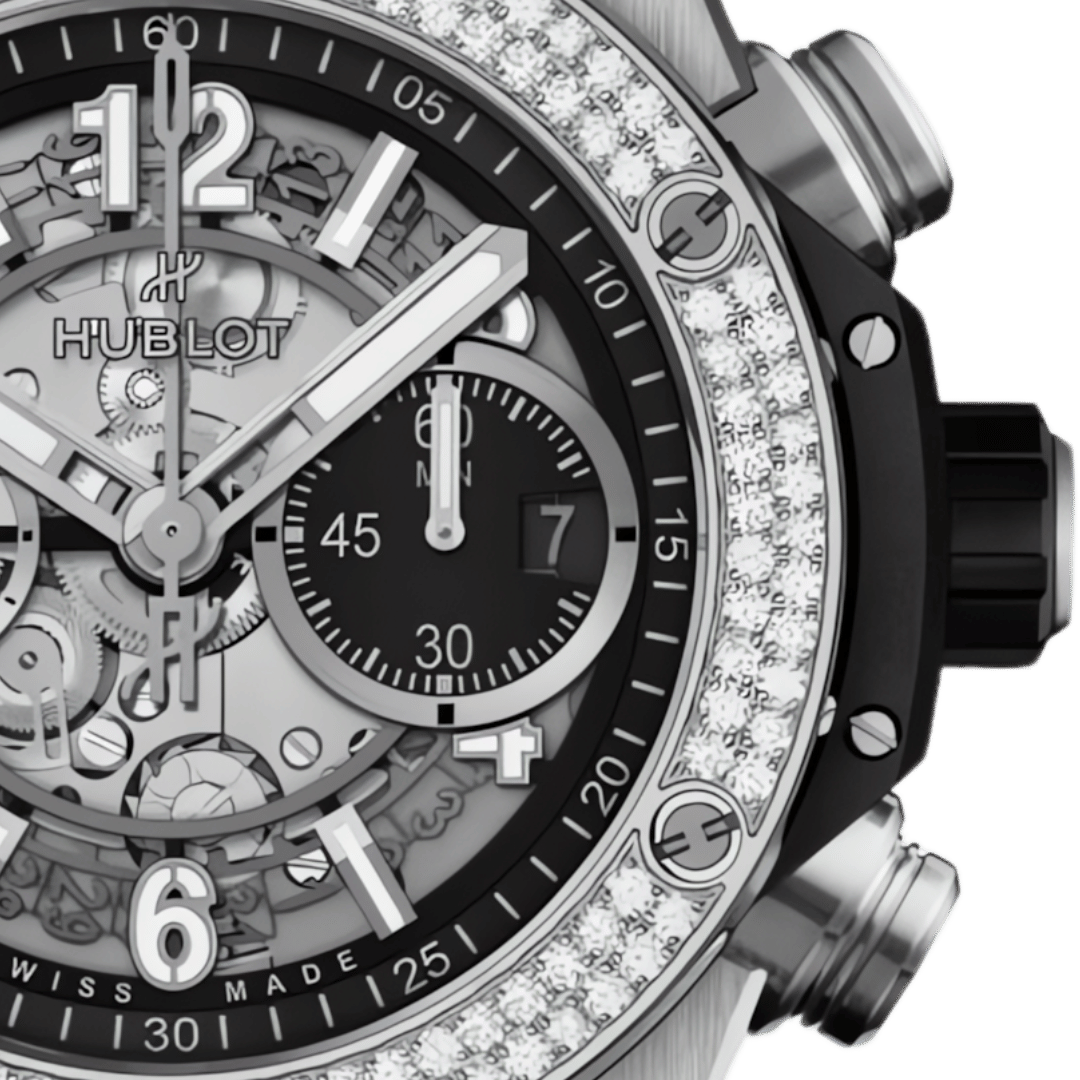 Vẻ đẹp lấp lánh, tỏa sáng rực rỡ từ mọi góc độ của những viên kim cương này là thành quả của kỹ thuật nạm đá đỉnh cao từ các nghệ nhân Hublot, thể hiện sự hòa quyện tuyệt vời và đầy táo bạo giữa vật liệu kỹ thuật tiên tiến và sự sang trọng tối thượng của kim hoàn, đúng theo triết lý ‘Art of Fusion’ đã làm nên tên tuổi thương hiệu.
