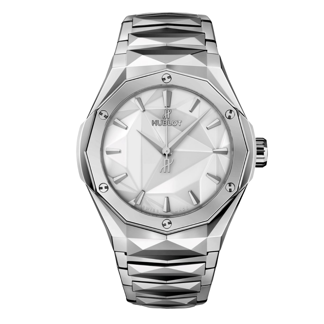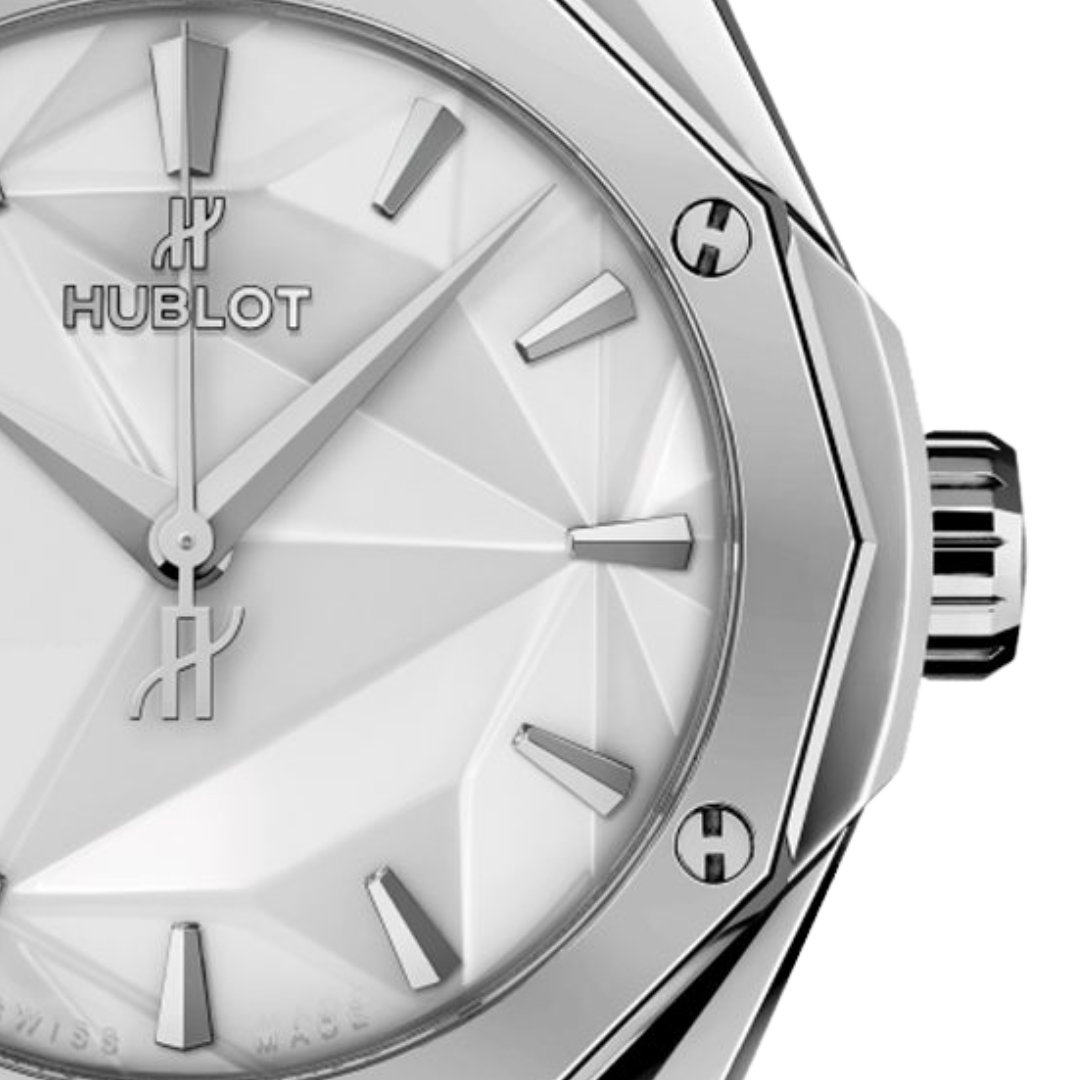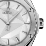 Hublot Classic Fusion Orlinski Titanium White 40mm 550.NS.2200.RW.ORL20 là sự hòa quyện đầy phong cách giữa nghệ thuật điêu khắc của Richard Orlinski và vẻ đẹp tinh khiết, tươi sáng của sắc trắng qua chất liệu titanium hiện đại của Hublot. Với đường kính 40mm, giúp phô diễn thiết kế đa diện phức tạp và đặc trưng, với vô số mặt cắt và góc cạnh được chế tác tỉ mỉ trên toàn bộ vỏ titanium.Vành bezel titanium đa diện, với 6 vít hình chữ H biểu tượng, hoàn thiện một cách hoàn hảo cấu trúc điêu khắc này.