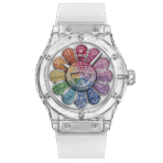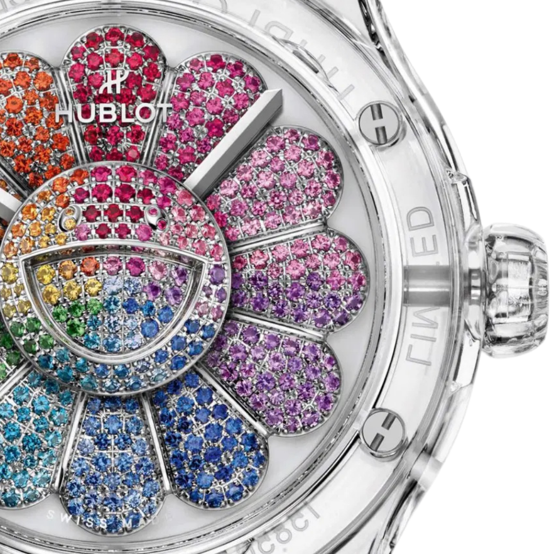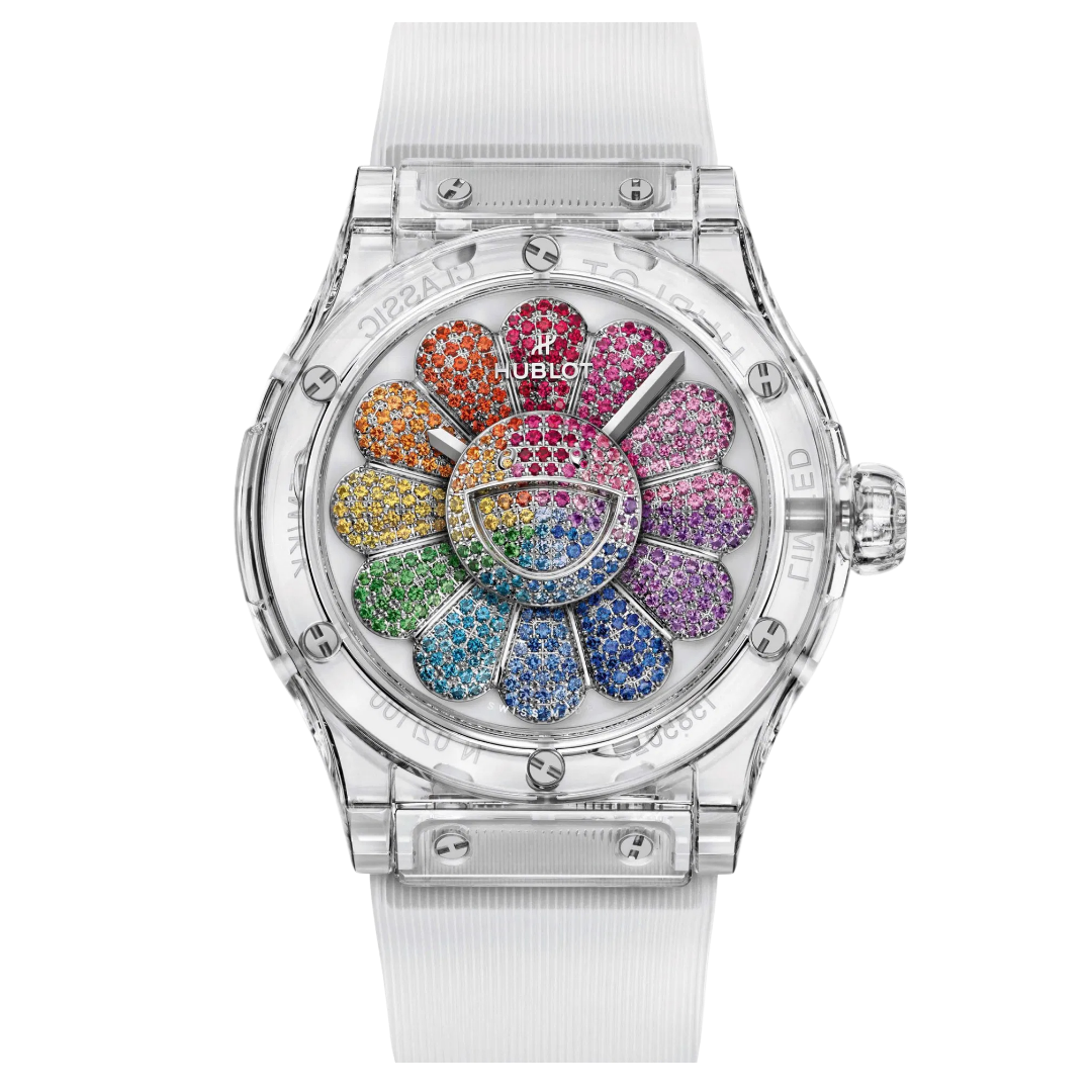 Hublot Classic Fusion Takashi Murakami Sapphire Rainbow 45mm 507.JX.0800.RT.TAK21 là một chiếc đồng hồ Hublot độc đáo, kết hợp hoàn hảo giữa sự sáng tạo nghệ thuật và kỹ thuật chế tác đồng hồ đỉnh cao. Được hợp tác với họa sĩ nổi tiếng Takashi Murakami, chiếc đồng hồ này mang đậm dấu ấn của nghệ thuật đương đại, với mặt số đầy màu sắc và thiết kế mang tính biểu tượng. Các viên sapphire đa sắc xung quanh viền bezel tạo nên hiệu ứng cầu vồng sống động, mang lại vẻ đẹp rực rỡ và nổi bật.