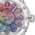 Với đường kính 45mm, Hublot Classic Fusion Takashi Murakami Sapphire Rainbow 507.JX.0800.RT.TAK21 cùng các chi tiết màu sắc được thiết kế một cách tỉ mỉ, phản ánh sự phóng khoáng và sáng tạo của Takashi Murakami. Các kim giờ, phút và giây được phủ lớp dạ quang giúp dễ dàng theo dõi thời gian trong điều kiện thiếu sáng, trong khi các cọc số đơn giản nhưng đầy nghệ thuật tăng thêm vẻ độc đáo cho mặt số.