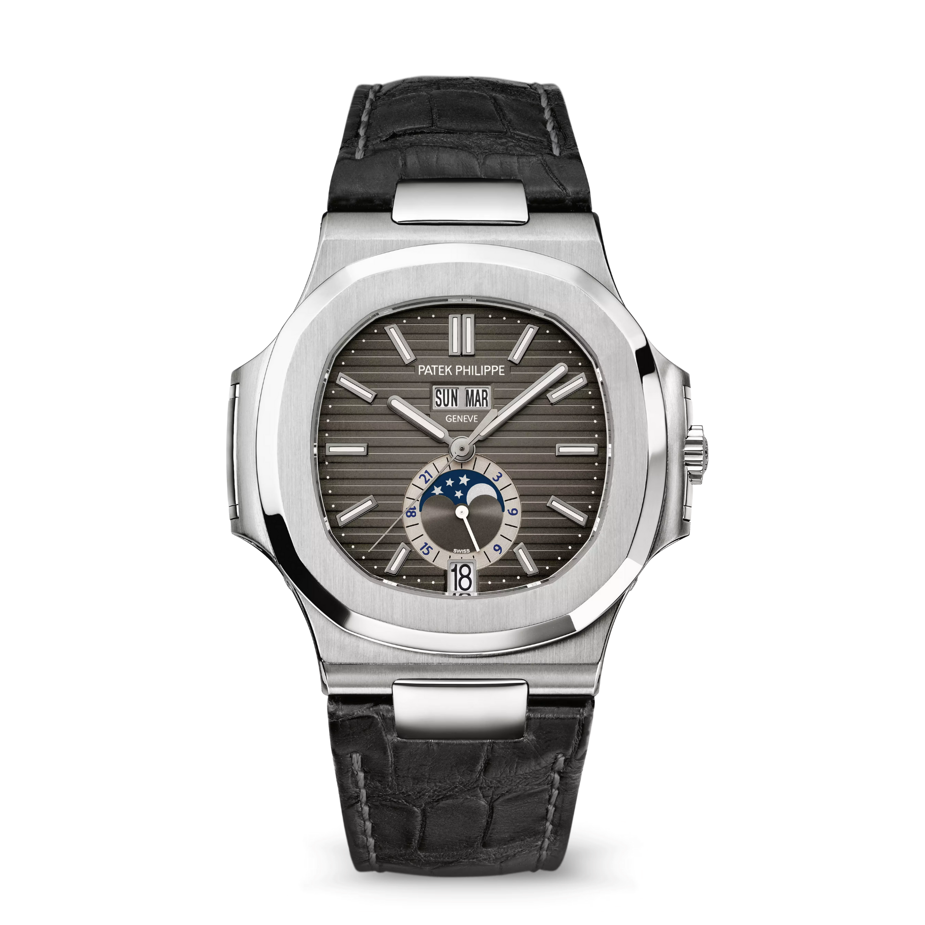 Patek Philippe Nautilus 5726A-001 là hiện thân của vẻ đẹp lịch lãm, trưởng thành và mang đậm chất “quý ông” nhất trong đại gia đình Nautilus. Điểm khác biệt “chí mạng” của phiên bản này so với những người anh em dây kim loại hầm hố chính là sự kết hợp tinh tế giữa bộ vỏ thép không gỉ 40.5mm với dây đeo da cá sấu đen mờ sang trọng (thường đi kèm thêm dây composite chống nước). Mặt số màu Đen khói (Black Gradient) chuyển màu từ xám đậm ở trung tâm sang đen tuyền ở viền tạo chiều sâu hút mắt, làm nền hoàn hảo cho tính năng Lịch thường niên (Annual Calendar) được sắp xếp cân xứng: cửa sổ Thứ/Tháng ở trên và Lịch ngày/Trăng ở dưới.