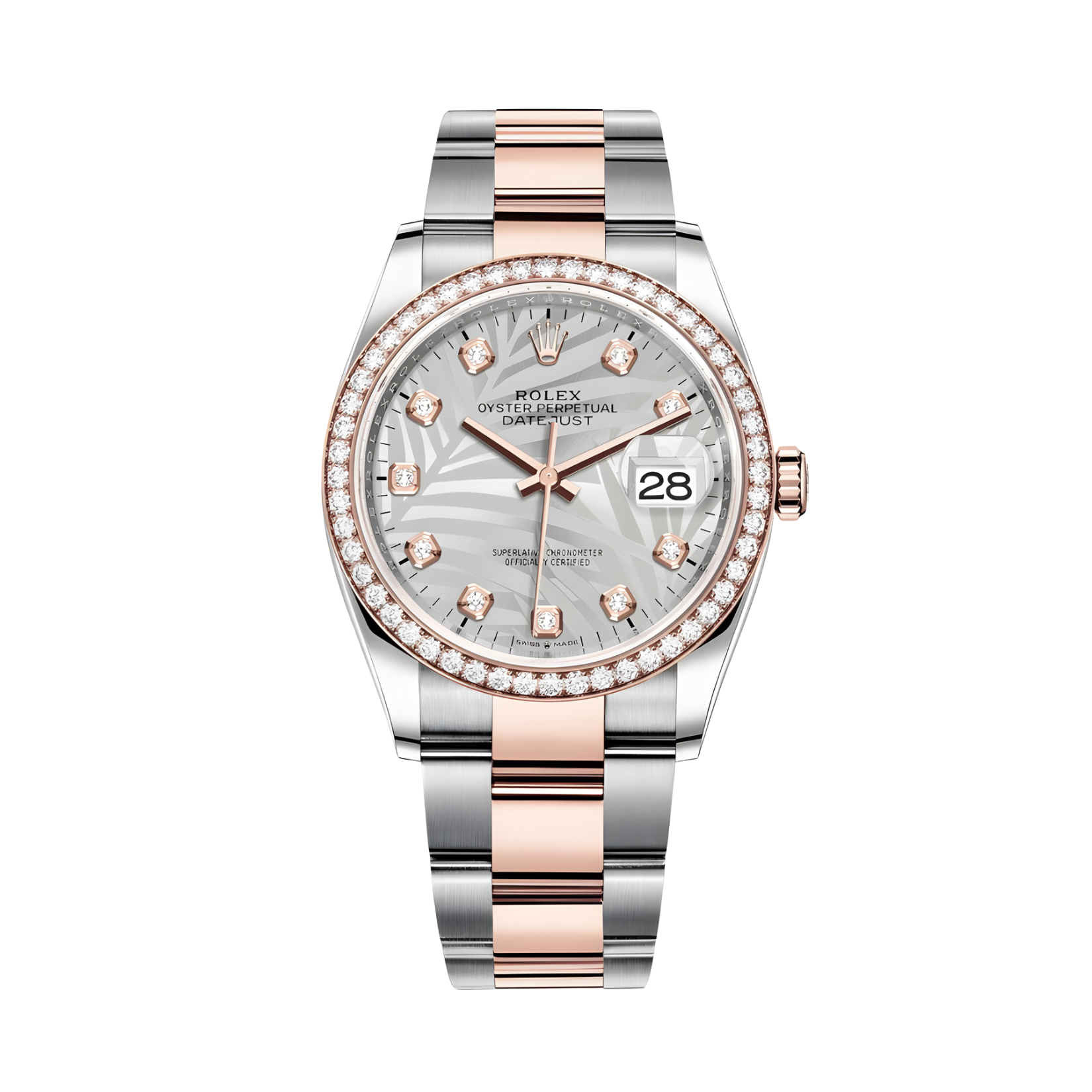 Rolex Datejust 36 126281RBR-0026 Mặt Số Lá Cọ Bạc mang diện mạo vô cùng lộng lẫy và tinh xảo với bộ vỏ Oyster 36mm chế tác từ sự kết hợp giữa thép Oystersteel siêu bền và Vàng Everose 18K. Điểm nhấn đắt giá nhất chính là vành bezel nạm kim cương rực rỡ, kết hợp cùng mặt số họa tiết lá cọ màu bạc (Silver Palm Motif) được khắc laser tinh xảo, tạo nên vẻ đẹp thiên nhiên đầy tính nghệ thuật. Các cọc số nạm kim cương lấp lánh càng làm tăng thêm phần vương giả cho tổng thể thiết kế.