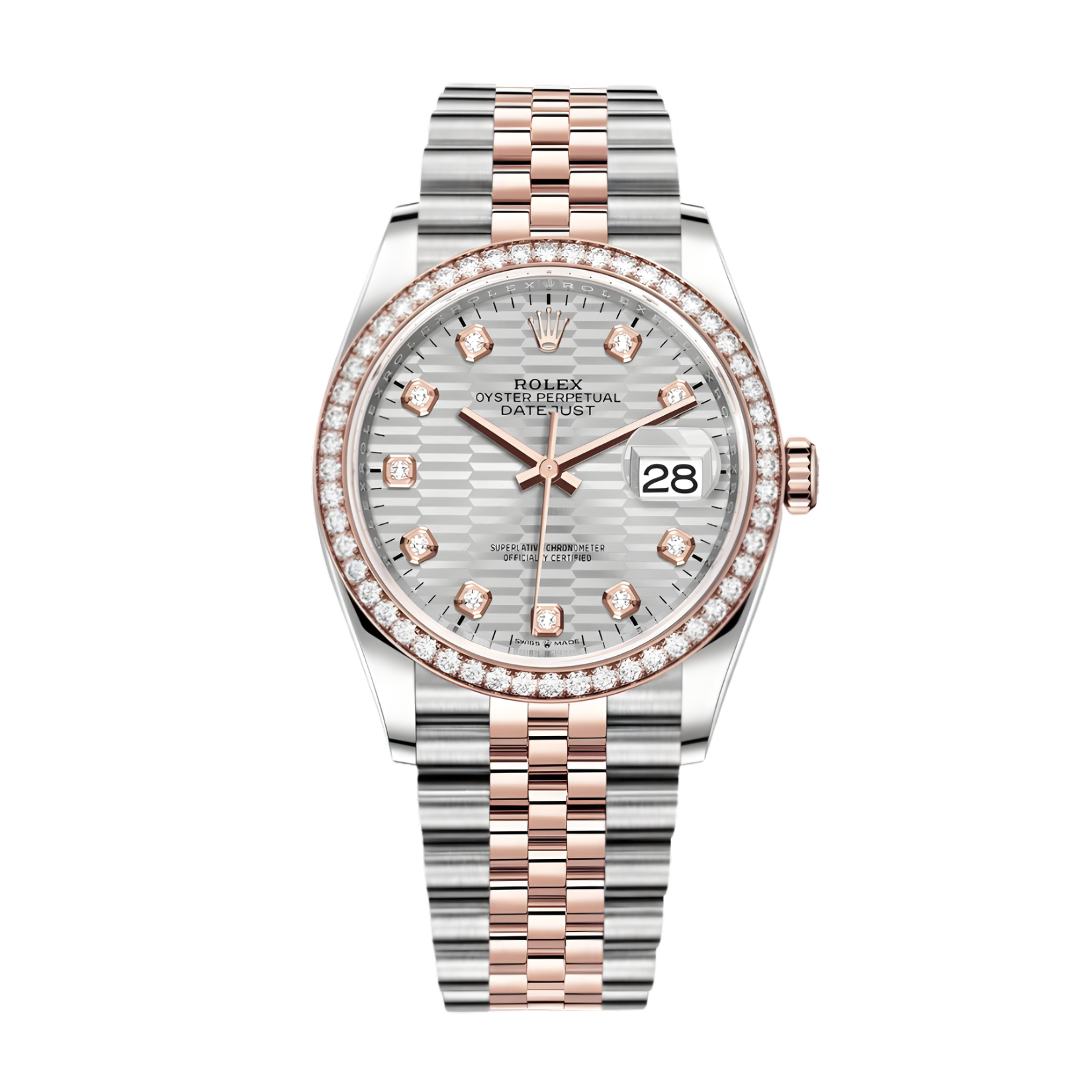 Rolex Datejust 36 126281RBR-0027 Mặt Số Nếp Gấp Bạc mang diện mạo lộng lẫy với bộ vỏ Oyster 36mm chế tác từ thép Oystersteel và Vàng Everose 18K. Phiên bản này đặc biệt tỏa sáng rực rỡ nhờ vành bezel nạm kim cương tinh tuyển. Điểm nhấn đắt giá nhất chính là mặt số họa tiết nếp gấp màu bạc (Silver Fluted Motif) được chế tác bằng kỹ thuật khắc laser tinh xảo, tạo hiệu ứng chiều sâu 3D đầy nghệ thuật và sắc nét, kết hợp hoàn hảo cùng các cọc số vạch phủ dạ quang Chromalight.