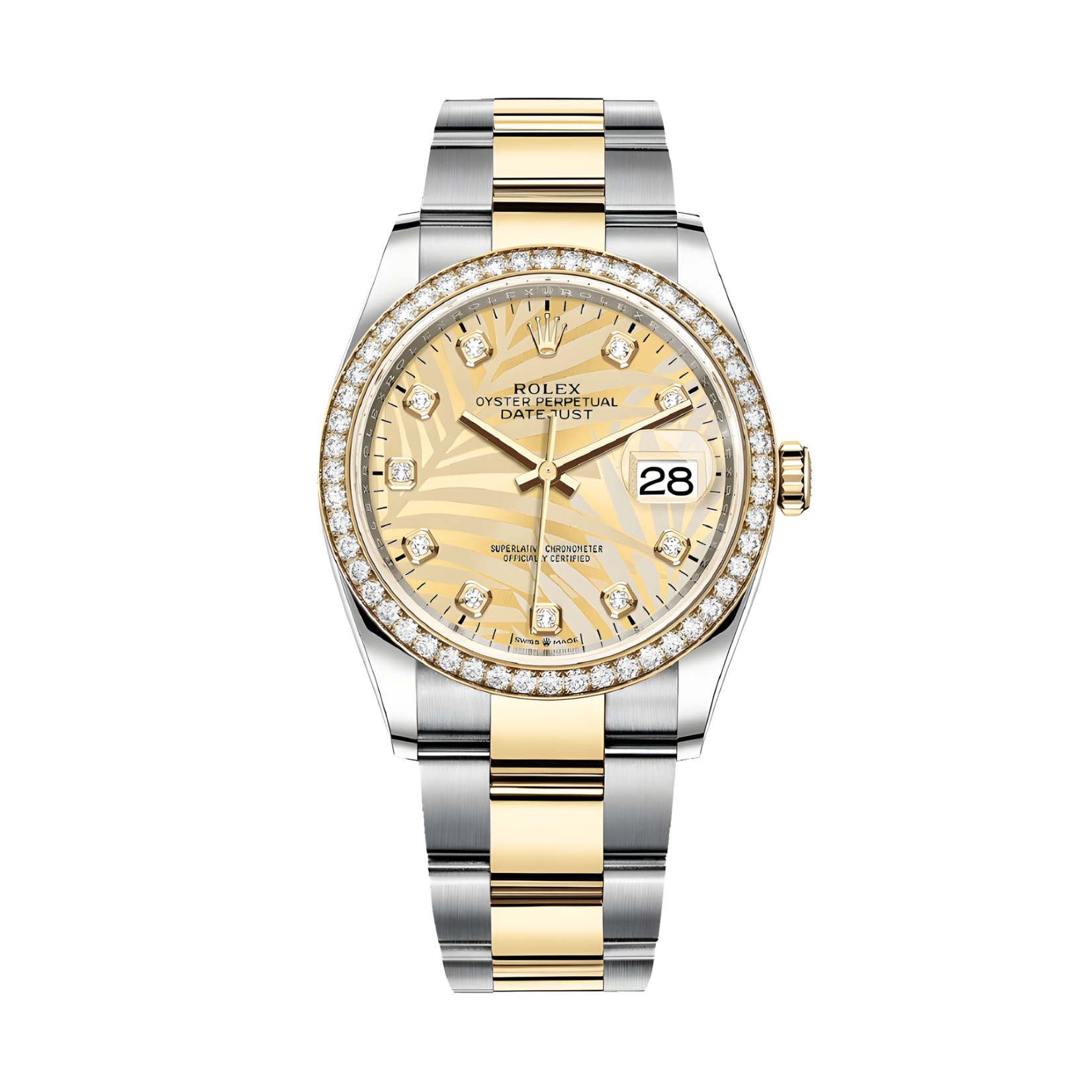 Rolex Datejust 36 126283RBR-0030 Mặt Số Lá Cọ Vàng mang diện mạo vô cùng lộng lẫy và độc đáo với bộ vỏ Oyster 36mm chế tác từ sự kết hợp giữa thép Oystersteel siêu bền và Vàng vàng 18K. Điểm nhấn đắt giá nhất chính là vành bezel nạm kim cương rực rỡ, kết hợp cùng mặt số họa tiết lá cọ màu vàng (Golden Palm Motif) được khắc laser tinh xảo, mang lại vẻ đẹp nhiệt đới đầy phóng khoáng và nghệ thuật. Các cọc số vạch được phủ dạ quang Chromalight sắc nét giúp hiển thị tối ưu và tạo sự cân bằng cho mặt số.