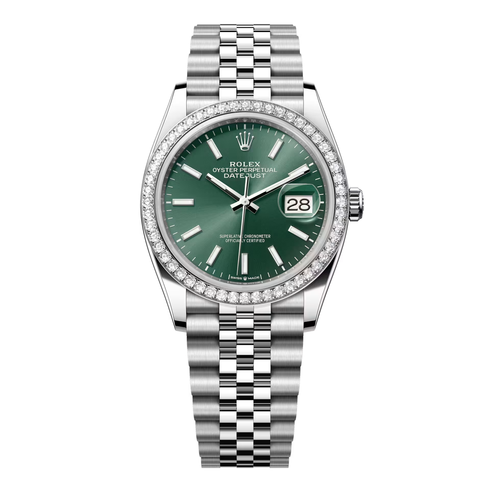 Rolex Datejust 36 126284RBR-0043 là sự kết hợp đầy mê hoặc giữa thép Oystersteel bền bỉ và vàng trắng 18ct quý phái, tạo nên diện mạo sang trọng và vô cùng hiện đại. Tâm điểm thu hút mọi ánh nhìn chính là mặt số màu xanh lá cây (Mint Green) thời thượng, làm nền tảng hoàn hảo cho các cọc số nạm kim cương lấp lánh. Vẻ lộng lẫy được đẩy lên đỉnh cao với vành bezel nạm kim cương tinh xảo kết hợp cùng dây đeo Jubilee 5 mối nối mềm mại, mang lại phong thái quý tộc và sức hút không thể rời mắt cho chủ nhân.