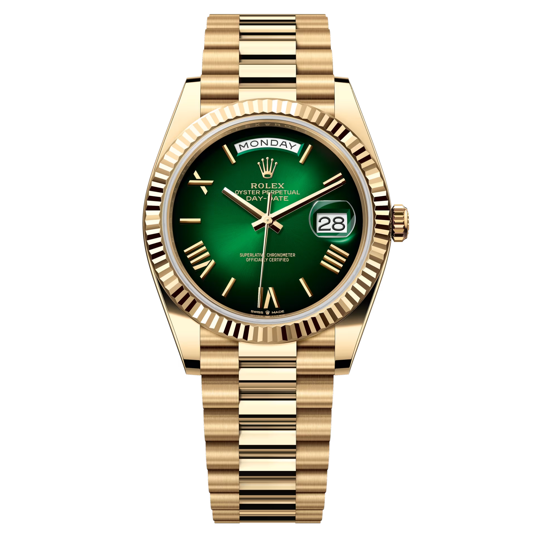 Rolex Day-Date 36 128238-0118 là biểu tượng tối thượng của sự thịnh vượng và quyền lực, khoác lên mình lớp vỏ vàng vàng 18k rực rỡ kết hợp cùng mặt số Green Ombré (Xanh lá chuyển màu) đầy mê hoặc. Sắc xanh lục bảo – tông màu di sản của Rolex – được biến tấu nghệ thuật với hiệu ứng chuyển sắc từ sáng ở trung tâm sang đen thẫm ở viền, tạo nên chiều sâu thị giác hút mắt và huyền bí. Sự sang trọng được đẩy lên tột đỉnh khi các cọc số được thay thế bằng những viên kim cương lấp lánh, tỏa sáng rực rỡ trên nền xanh thẫm, tương phản hoàn hảo với ánh vàng kim của vành khía (Fluted Bezel) sắc sảo.