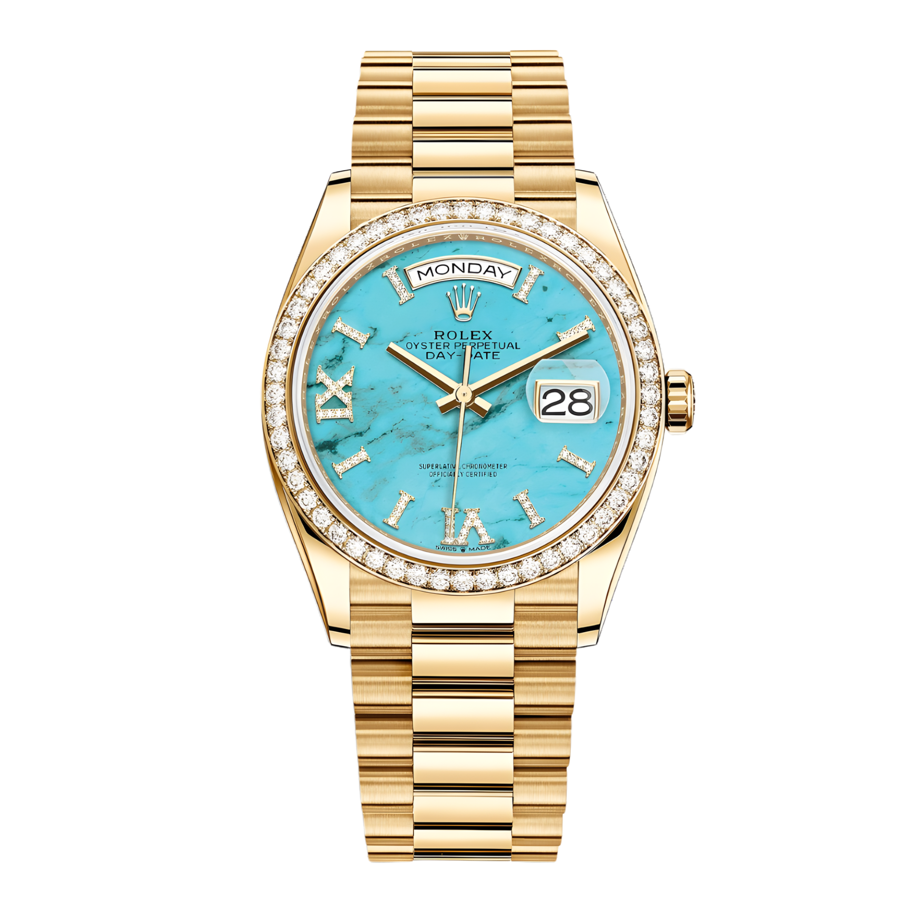 Trên nền xanh ngọc quyến rũ, sự vương giả được khẳng định qua các cọc số La Mã bằng vàng 18ct, đặc biệt tại vị trí 6 giờ và 9 giờ được nạm kim cương lấp lánh, giúp chủ nhân toát lên vẻ đẹp quý phái, sự tinh tế và đẳng cấp thượng lưu. Sự hoàn mỹ của phiên bản này được hoàn thiện tuyệt đối với dây đeo President ba mối nối bán nguyệt bằng vàng đúc đặc, mang lại cảm giác đeo đầm chắc, ôm sát cổ tay và tỏa sáng uy nghi. Ẩn sau diện mạo tuyệt mỹ là sức mạnh của bộ máy cơ học thượng thừa Calibre 3255, tích hợp cơ cấu hồi Chronergy giúp tối ưu hóa hiệu năng và cung cấp mức dự trữ năng lượng lên đến 70 giờ. Với chứng nhận Superlative Chronometer và hệ thống chống nước 100 mét, chiếc Day-Date vàng khối mặt đá Turquoise này không chỉ là món trang sức xa xỉ khó tìm mà còn là lá bùa hộ mệnh mang lại may mắn và sự thịnh vượng cho các chủ nhân tinh hoa.