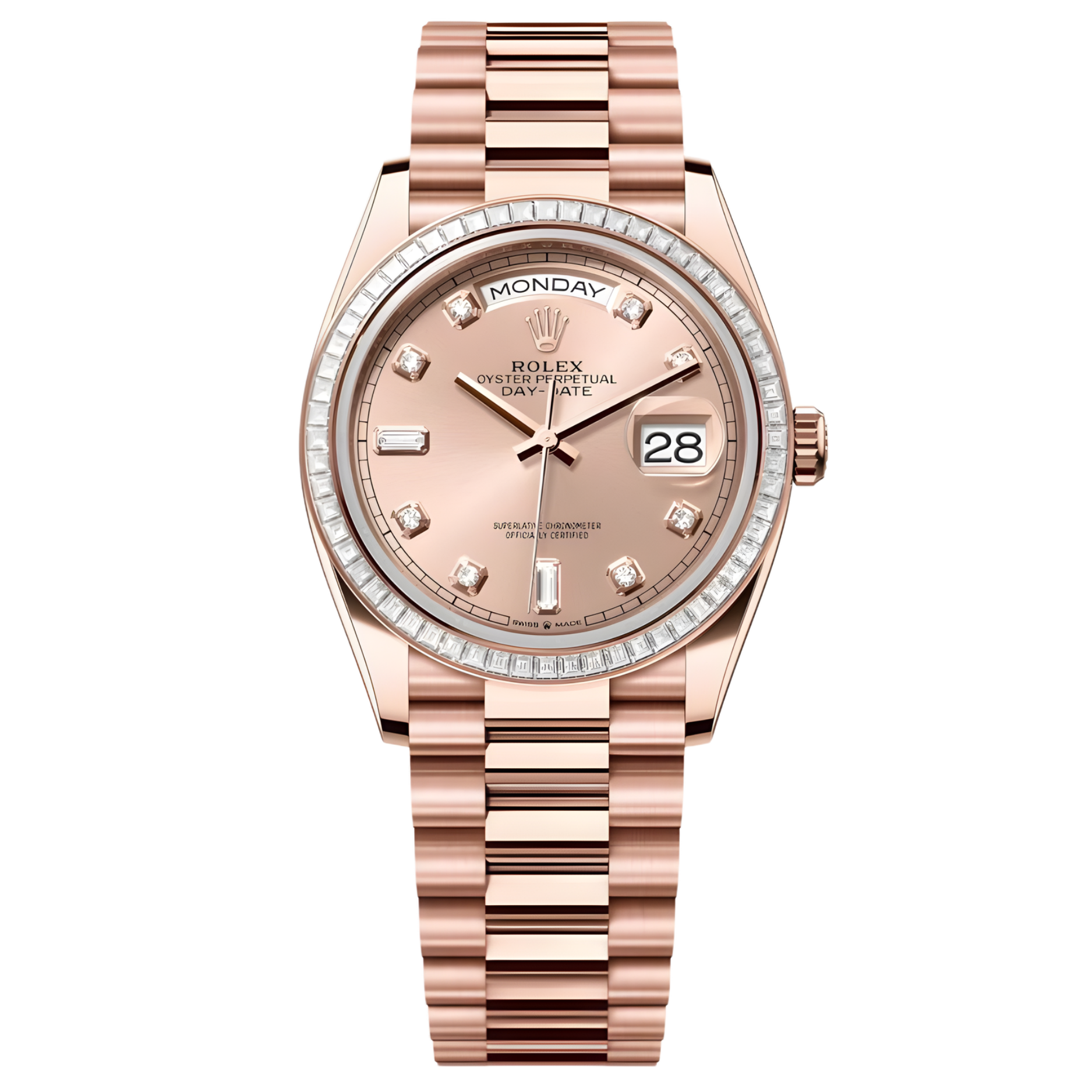 Sự hoàn mỹ của phiên bản này được hoàn thiện tuyệt đối với dây đeo President ba mối nối bán nguyệt bằng vàng đúc đặc, mang lại cảm giác đeo mềm mại, ôm sát cổ tay và tôn lên khí chất đài các của giới thượng lưu. Ẩn sau diện mạo kiều diễm là sức mạnh của bộ máy cơ học thế hệ mới Calibre 3255, tích hợp cơ cấu hồi Chronergy giúp tối ưu hóa hiệu năng và cung cấp mức dự trữ năng lượng lên đến 70 giờ. Với chuẩn xác tuyệt đối Superlative Chronometer và hệ thống chống nước 100 mét cùng ô cửa sổ lịch thứ-ngày trứ danh, chiếc Day-Date “Pink Baguette” này không chỉ là một món trang sức đắt giá tôn vinh nét đẹp nữ tính mà còn là minh chứng cho gu thẩm mỹ thời thượng của các chủ nhân sành điệu.