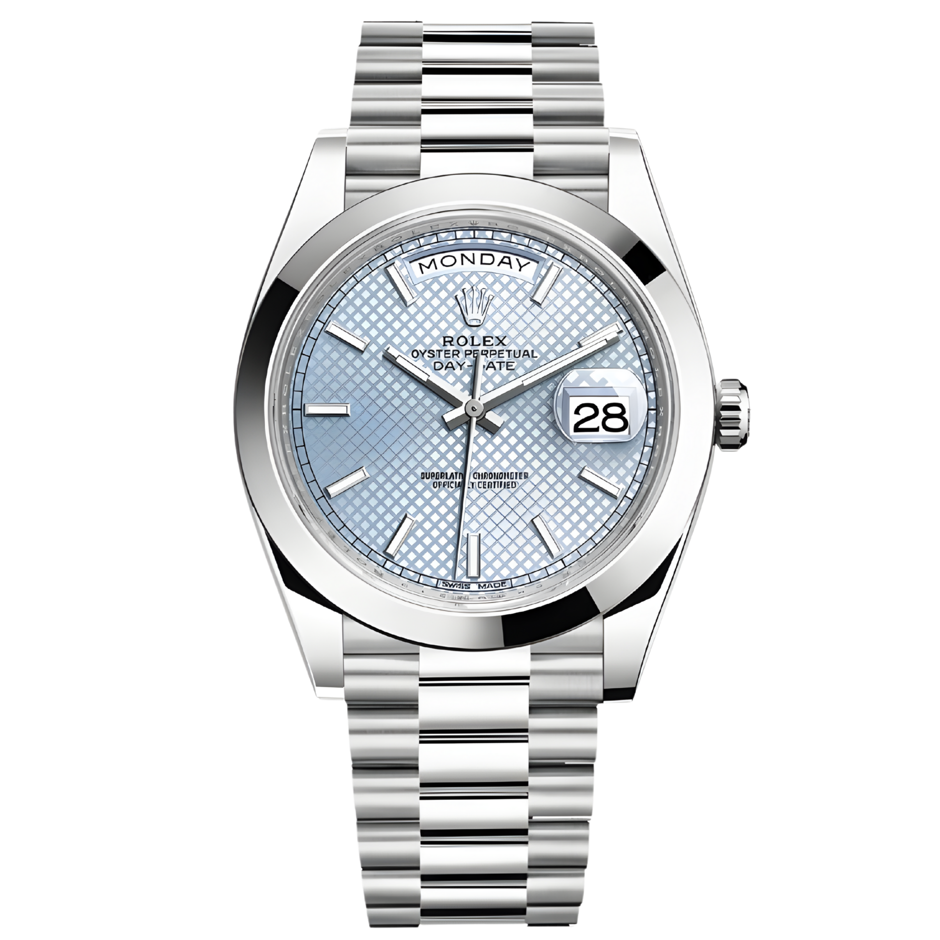 Rolex Day-Date 40 228206-0004 là hiện thân của vị thế độc tôn với vẻ đẹp lạnh lùng, thanh thoát và hiện đại. Chiếc đồng hồ được chế tác hoàn toàn từ Bạch kim (Platinum 950) – “vua của các loại kim khí”, sở hữu sắc trắng bạc vĩnh cửu và độ sáng bóng đặc biệt. Điểm nhận diện đẳng cấp chính là mặt số màu Xanh Băng (Ice Blue) mát lạnh – tông màu độc quyền chỉ dành riêng cho các dòng đồng hồ Platinum của Rolex. Khác với vẻ lấp lánh phô trương của vành khía hay kim cương, phiên bản này sở hữu vành bezel trơn (Domed Bezel) được đánh bóng loáng như gương, kết hợp cùng bộ cọc số La Mã sắc sảo, tạo nên diện mạo tinh tế, điềm đạm nhưng vẫn toát lên khí chất vương giả khó cưỡng.