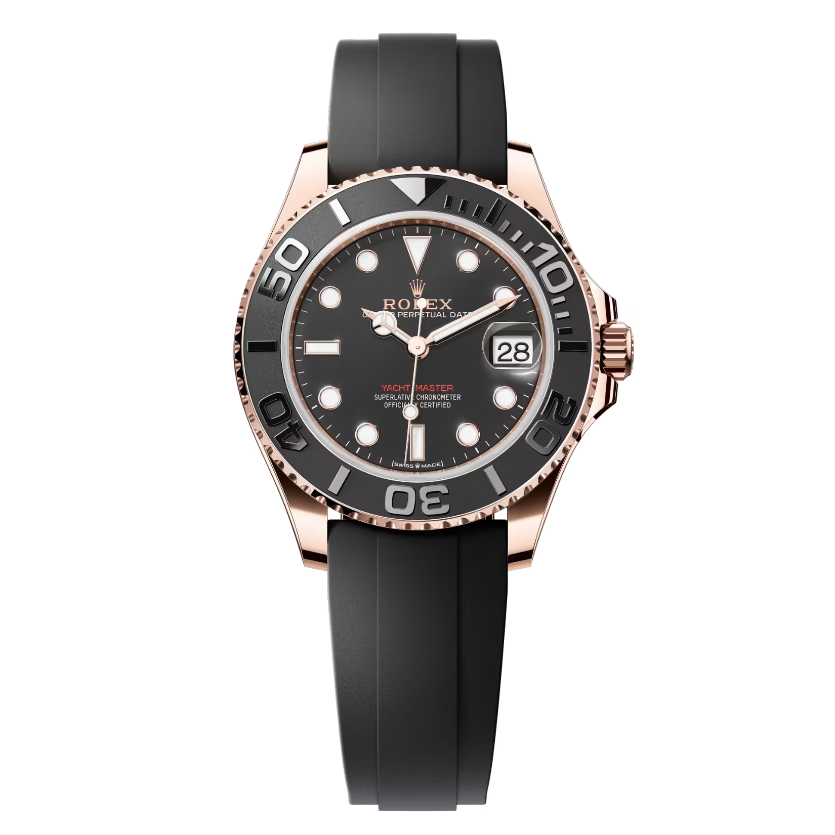 Rolex Yacht-Master 37 268655-0017 sở hữu bộ vỏ Oyster kích thước 37mm được chế tác từ Vàng hồng Everose 18K nguyên khối độc quyền. Vành bezel xoay hai chiều được trang bị lớp lót Cerachrom bằng gốm ceramic đen nhám, kết hợp cùng các chữ số và vạch chia 60 phút dập nổi được chà bóng. Mặt số màu đen mờ đi kèm hệ thống kim chỉ giờ và cọc số lớn phủ chất dạ quang Chromalight, hỗ trợ tối ưu khả năng đọc thời gian trong điều kiện thiếu sáng. Thiết kế mang lại sự tương phản cơ học rõ rệt giữa sắc ấm của vàng Everose và tông màu đen sâu thẳm của gốm công nghệ cao.