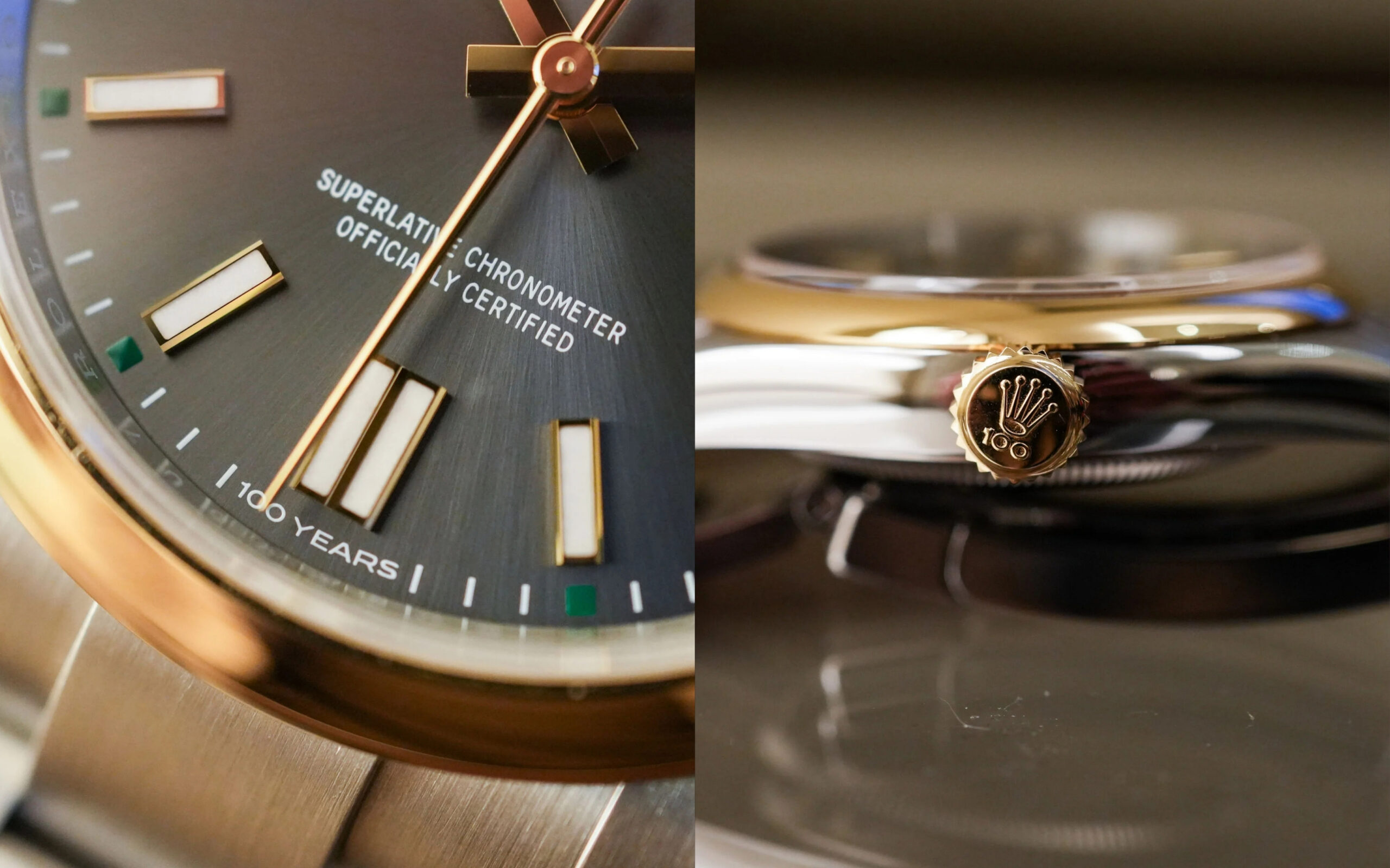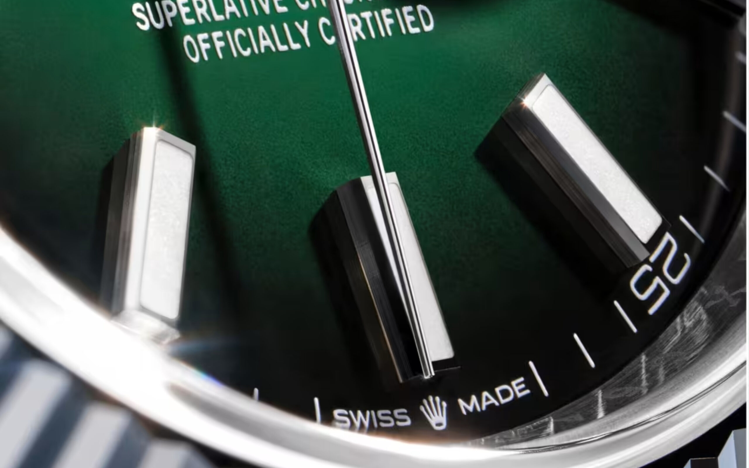 Những chi tiết trên mặt số xám đen của phiên bản này được tinh chỉnh vô cùng đắt giá nhằm vinh danh cột mốc thế kỷ. Dấu ấn lịch sử được khắc họa sắc nét qua núm vặn chạm nổi con số một trăm, trong khi dòng chữ “100 years” kiêu hãnh thay thế cho chứng nhận xuất xứ truyền thống ở vị trí sáu giờ. Nét chấm phá thanh lịch còn nằm ở các khoảng trống giữa vạch chia năm phút được đánh dấu bằng những ô vuông xanh lục, đồng điệu hoàn hảo với tên thương hiệu mang sắc xanh biểu tượng. Sự ra đời của cỗ máy này là minh chứng điển hình cho chứng nhận Superlative Chronometer được tăng cường áp dụng từ năm nay, thể hiện đam mê không ngừng vươn đến đỉnh cao cơ học.