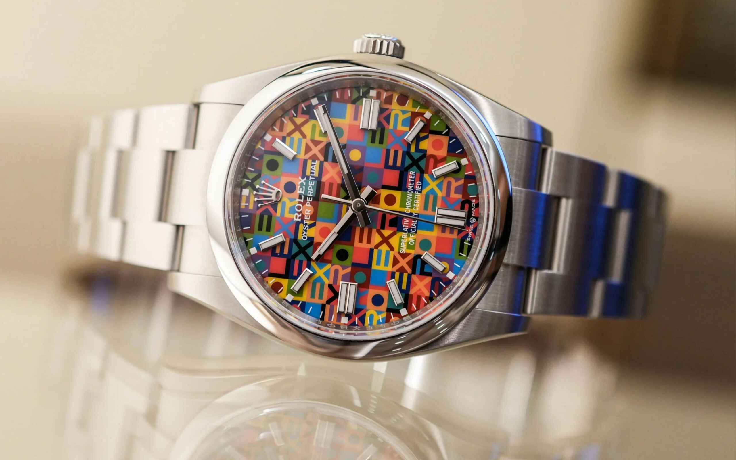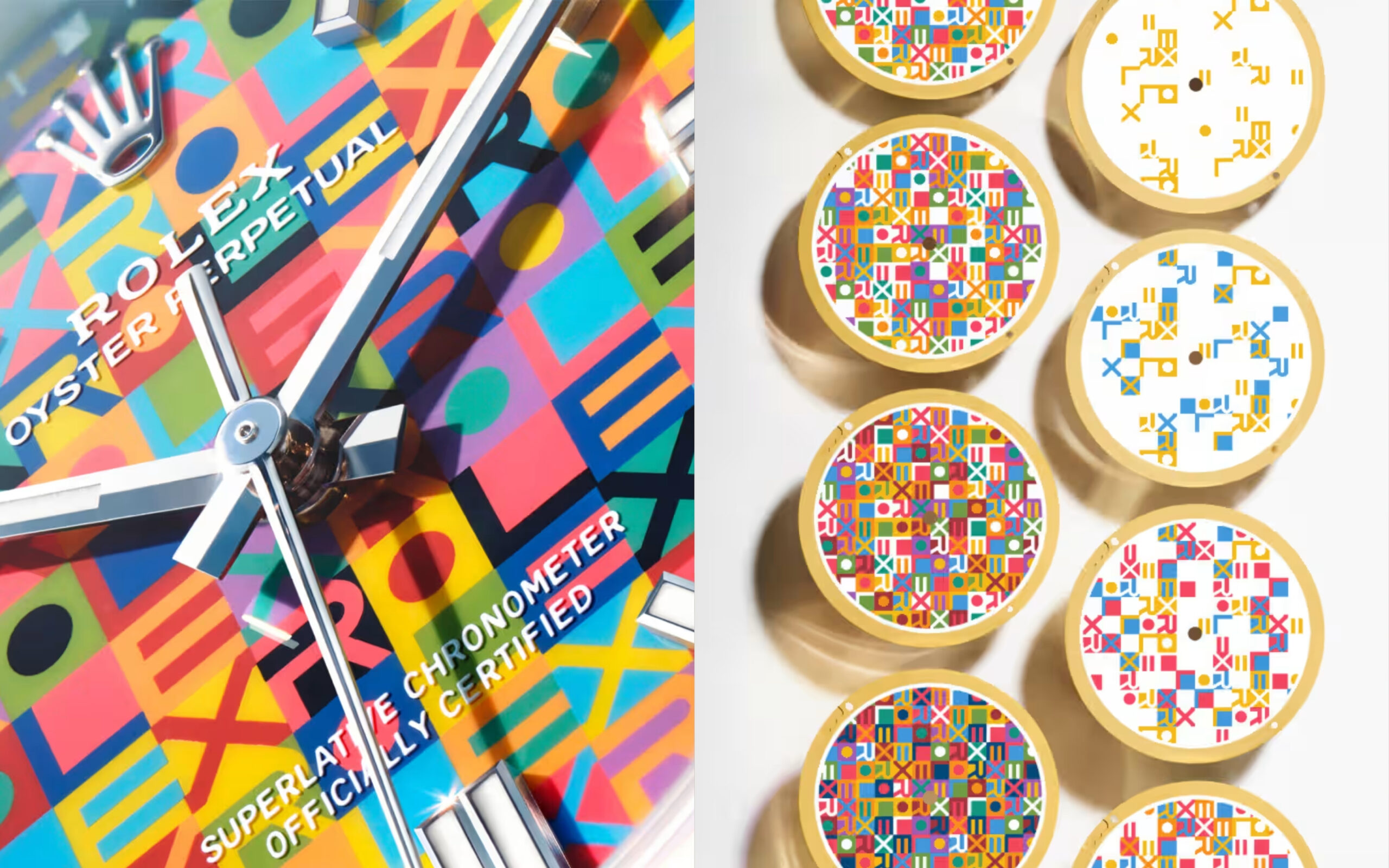Bên cạnh vẻ đẹp hoài cổ, một kiệt tác kích thước 36mm khác lại mang đến sự bùng nổ về màu sắc và kỹ nghệ chế tác mặt số đỉnh cao. Thiết kế này tái hiện lại họa tiết Jubilee từng được giới thiệu vào cuối thập niên bảy mươi dưới một lăng kính vui tươi nhưng vô cùng tinh tế. Các mẫu tự tạo nên tên thương hiệu được sắp xếp thành một bố cục hình học bắt mắt, phối hợp từ mười gam màu tương phản sống động, tôn vinh trọn vẹn sự sáng tạo phong phú của nhà sản xuất.